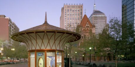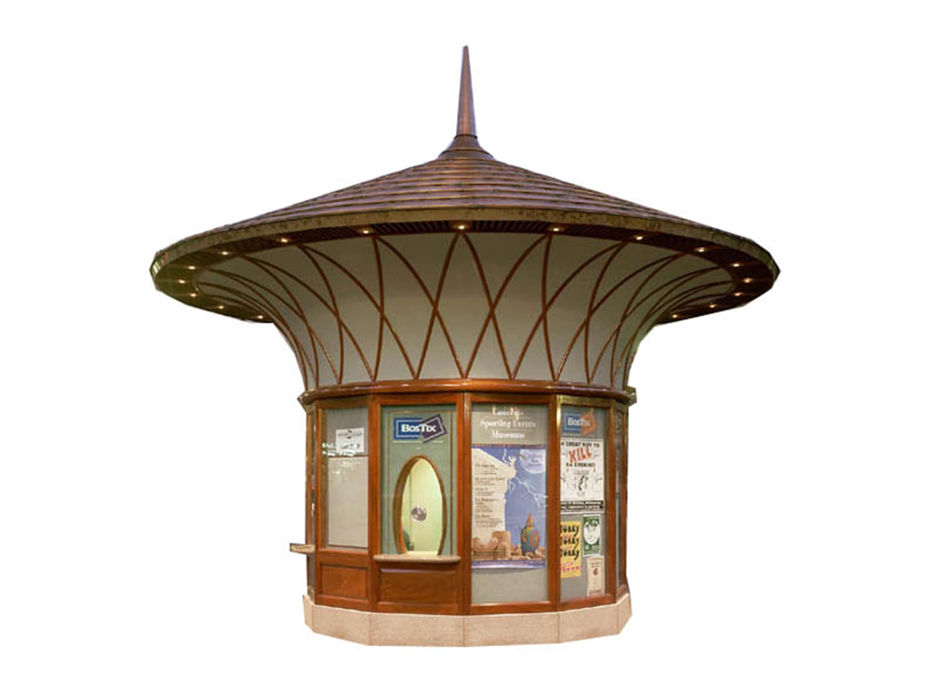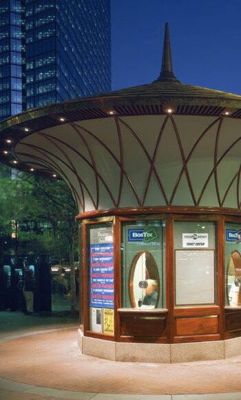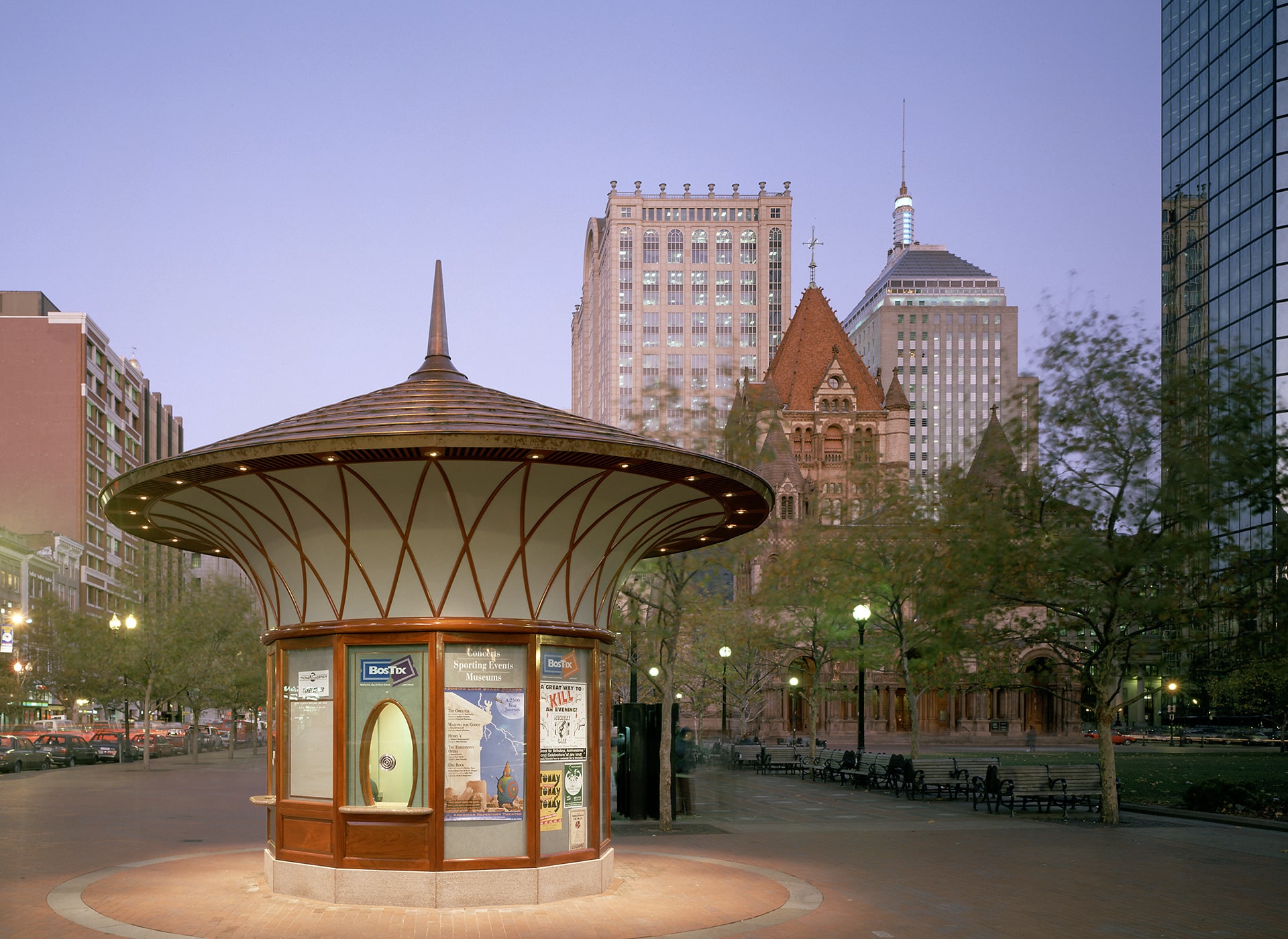 Nestled across from such architectural masterpieces as Trinity Church, the Boston Public Library, Old South Church, and the John Hancock Building, this kiosk has quickly become a new landmark in Boston’s historic Copley Square. Inspired by Parisian park pavilions, the copper, glass, and mahogany form adds a human-scaled dimension to the square.