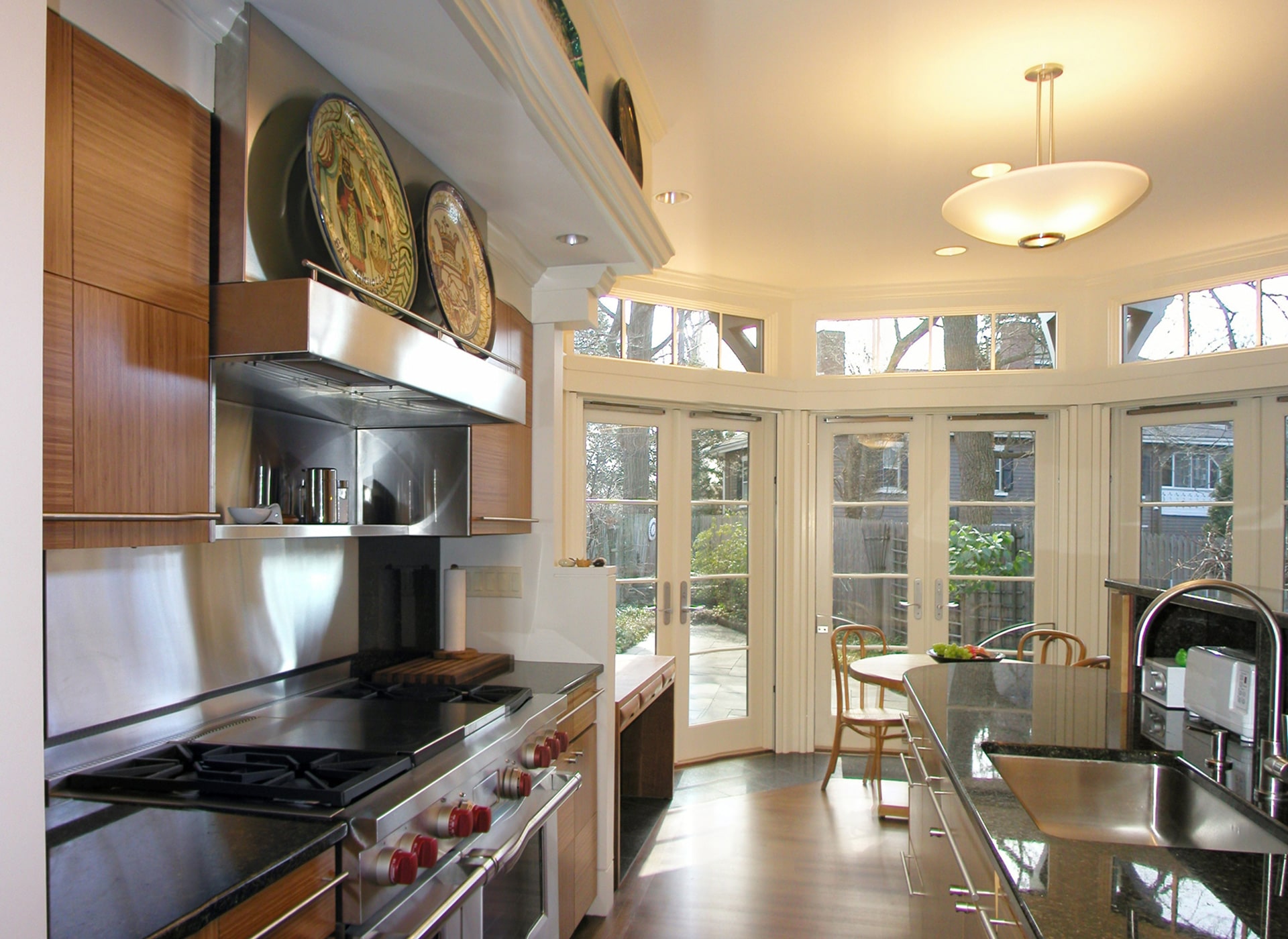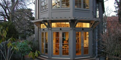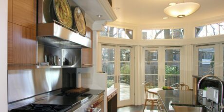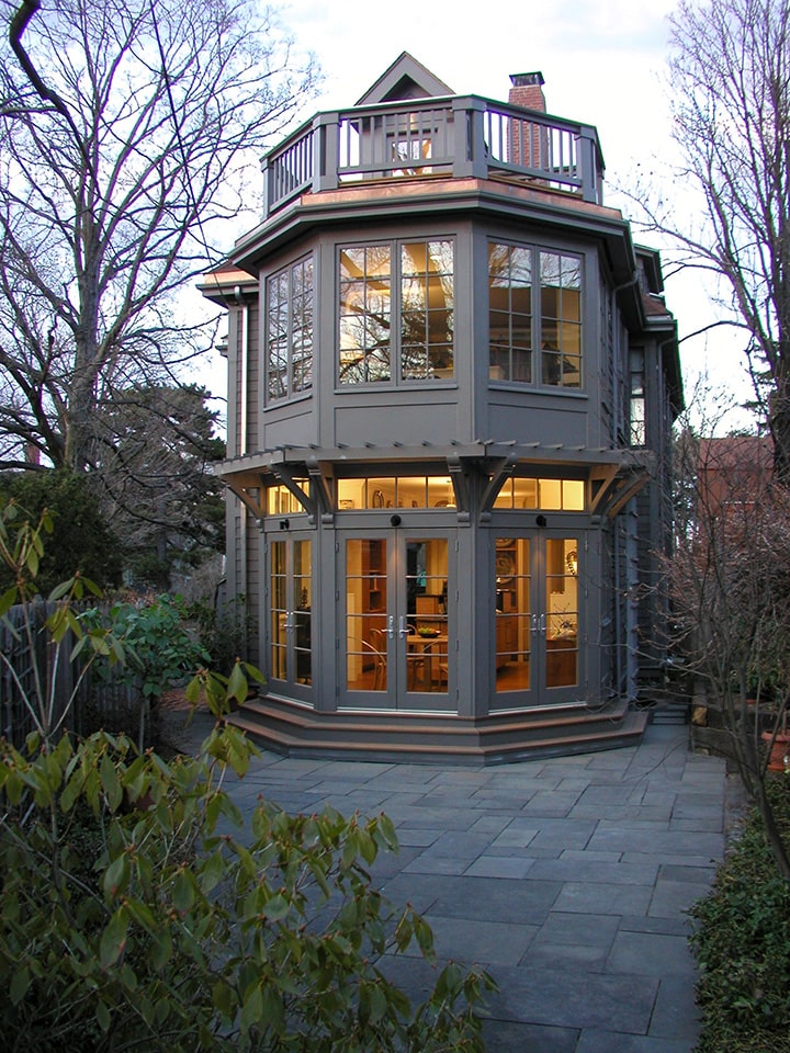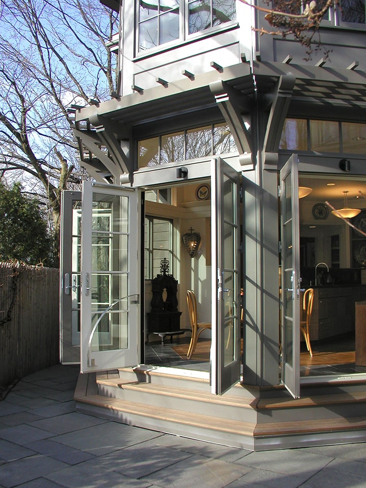 This kitchen renovation and two-story addition is set in the historic district of Chestnut Hill. There is a study and roof terrace upstairs . Downstairs, three sets of French doors wrap around the kitchen drawing in radiant daylight. When opened they instantly make the dining area feel like part of the garden. Intricate trellis work was designed to engage with the environment. Accommodations for active social lives as well as peaceful private time, this renovation and addition of a kitchen and breakfast area (with a study, solarium and terrace above) was designed to transform the rear interface of a Victorian house with its intimate private garden in a historic district in Brookline. The addition is designed as full, room-sized bay window and trellised garden pavilion that merges the indoor and outdoor experience year-round, accommodating an avid cook/homeowner’s work space within a visually composed sequence of social spaces.
