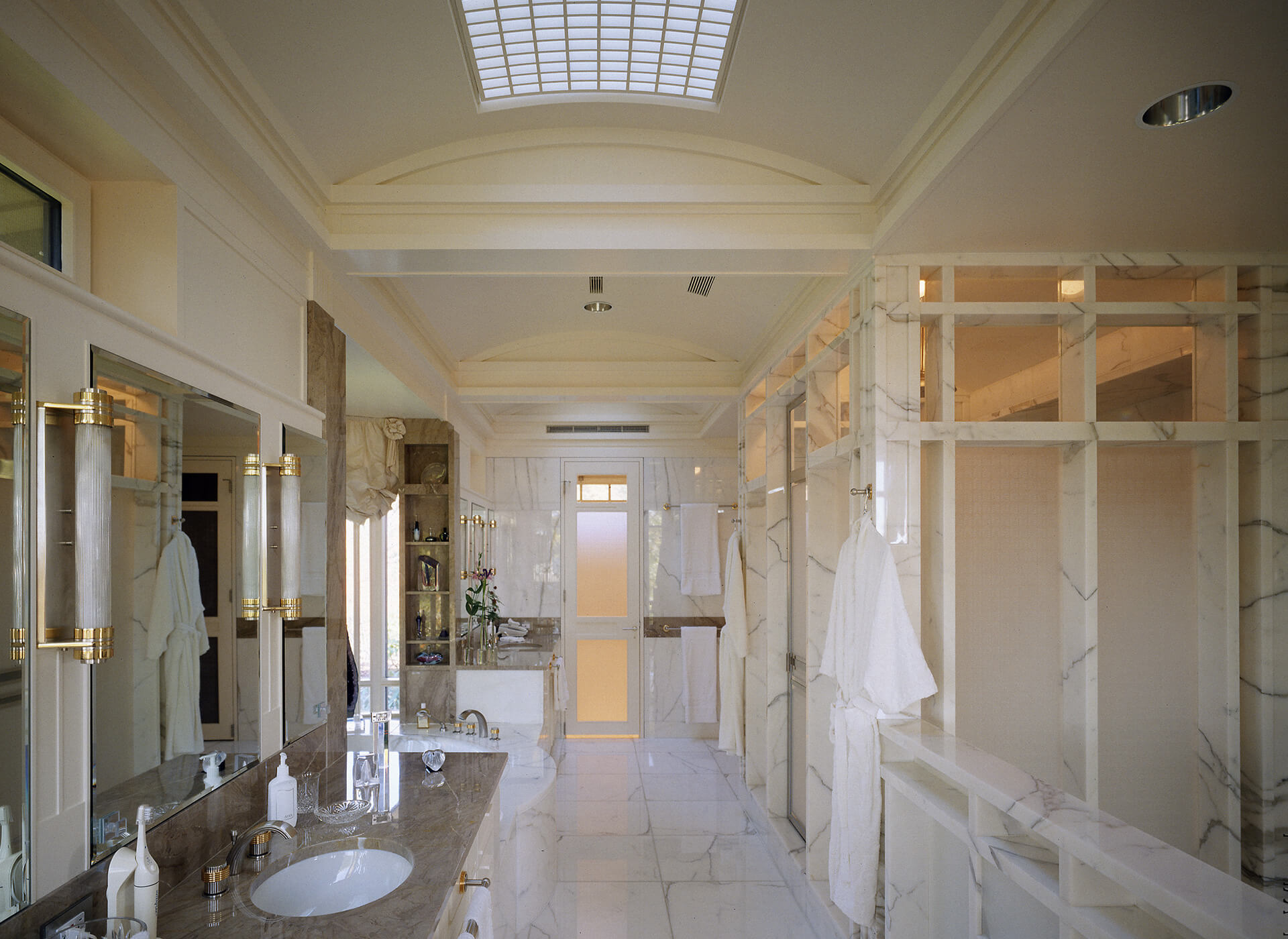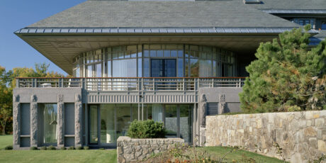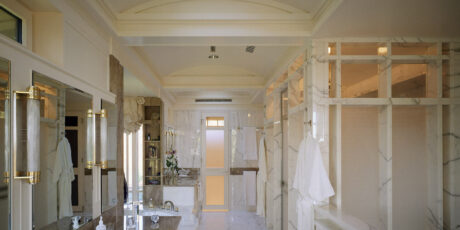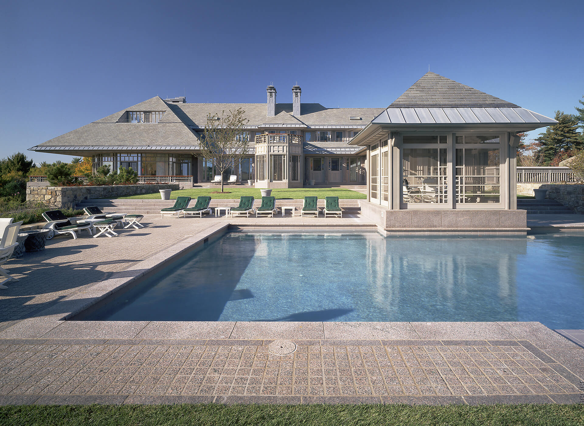 To accommodate an athletic family, this contemporary Weston estate features a squash court, tennis court, pool, and sauna. The home is protected from the elements above by a timeless slate roof. In the kitchen, Gaggenau and Sub-Zero appliances encourage culinary exploration. The bathroom marble was hand cut in Carrara, Italy. The home also contains an environmentally conscious Yazaki chiller.