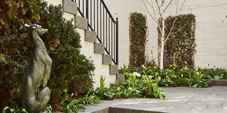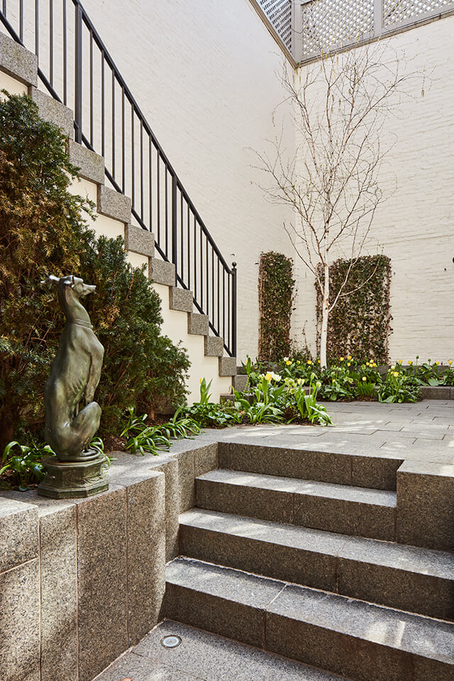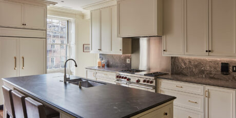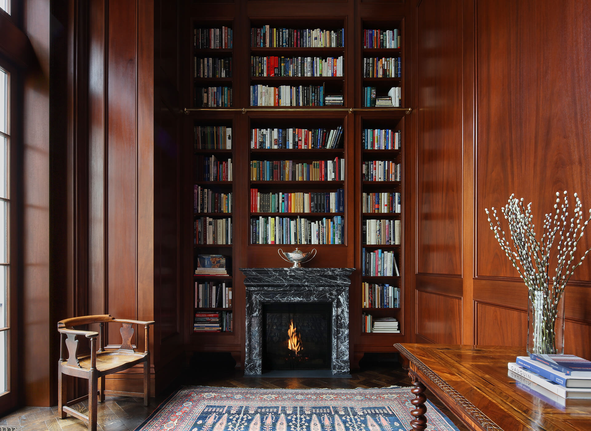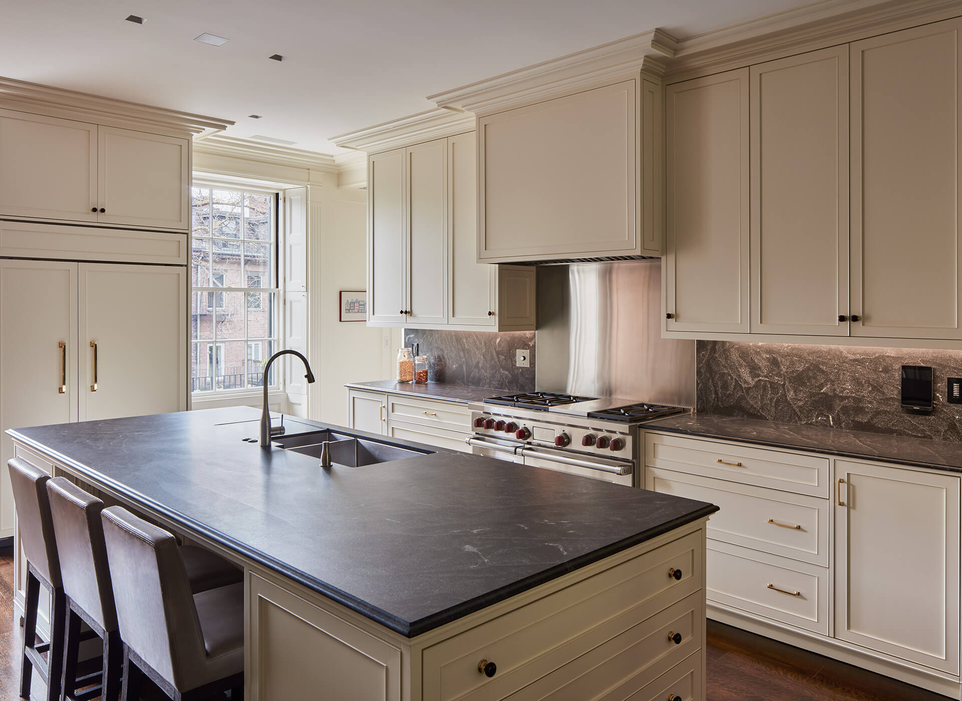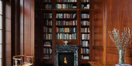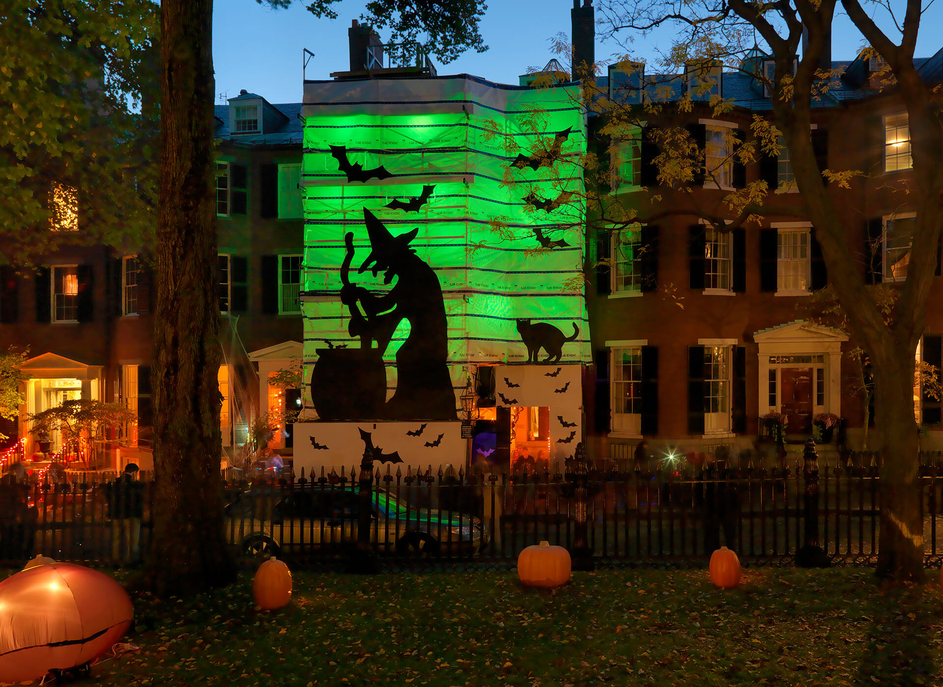 A painstaking restoration and renovation of a Beacon Hill classic. Views from the study look down on the Charles River and backyard garden. A stunning two-story library was crafted by Thoughtforms shop. In a warren of narrow streets that is logistically quite challenging, playfully-decorated Halloween scaffolding was used to welcome children and neighbors. To make the service complete, Thoughtforms staff were in costume to hand out treats to the trick-or-treaters!