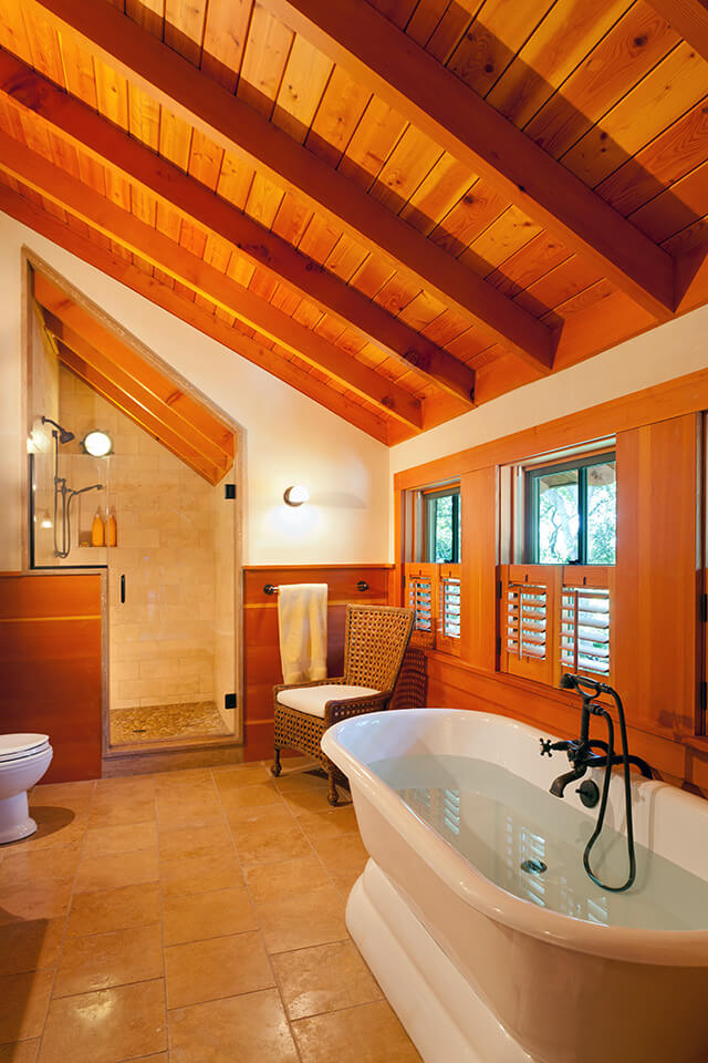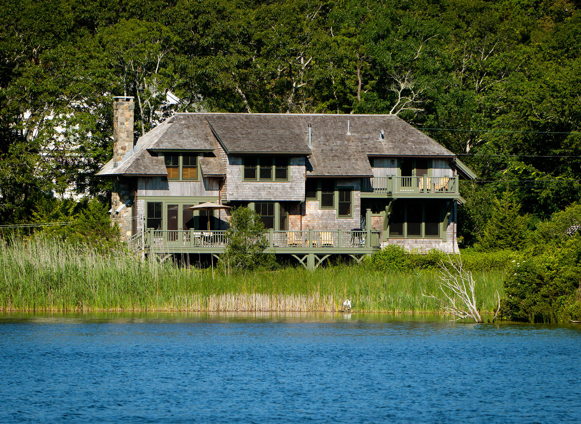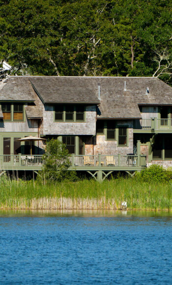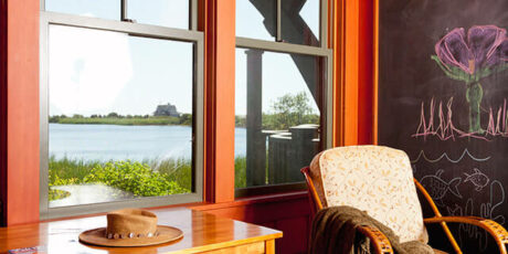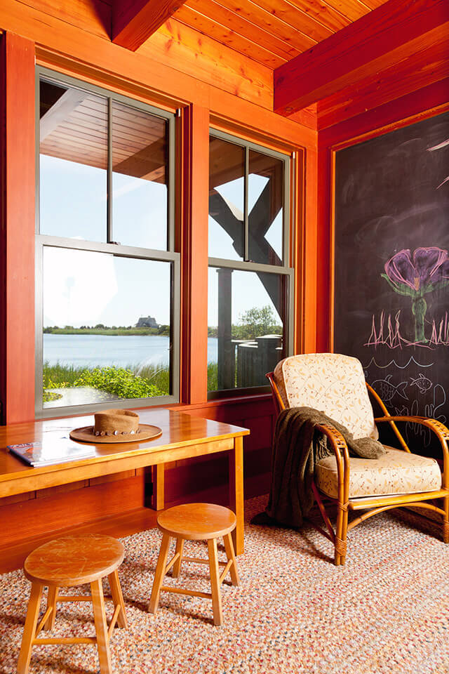 This environmentally-sensitive summer home is nestled into a bird-filled landscape over a salt marsh. Many natural elements and cozy sitting spaces were crafted into this home. The interiors include structural fir exposed framing, vertical grain fir walls and floors and reverse board and batten wainscoting. There is even a custom tree house tucked into the side yard featuring a basket on a line that can deliver treats to the elevated structure.