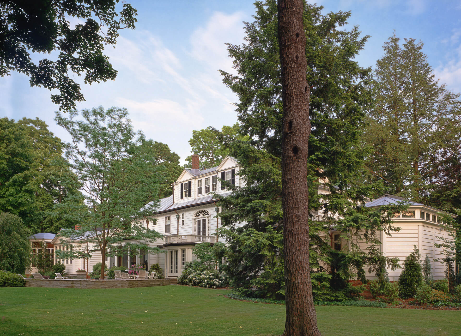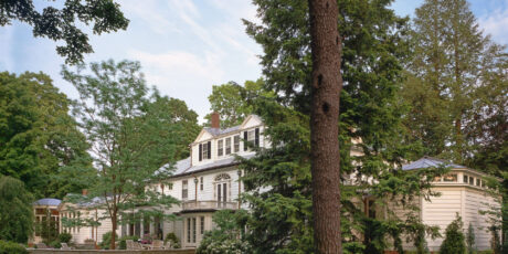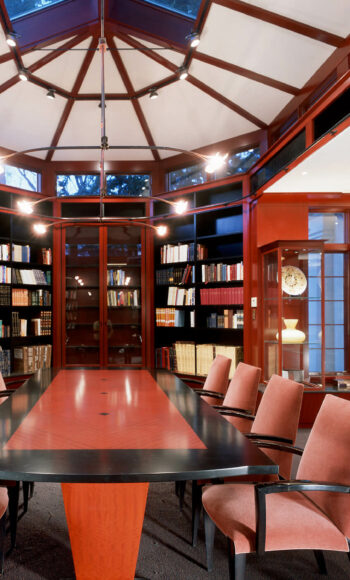 Although the additions to this 1920’s Colonial Revival home look traditional on the exterior, the interior spaces are sleek and contemporary. The additions were designed to resemble pavilions flanking the center block of the house. One side houses a spectacular home library with cabinets fashioned from pear wood. The other side houses an expanded kitchen and family gathering spaces.