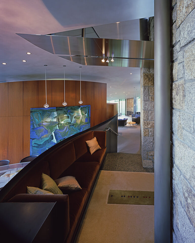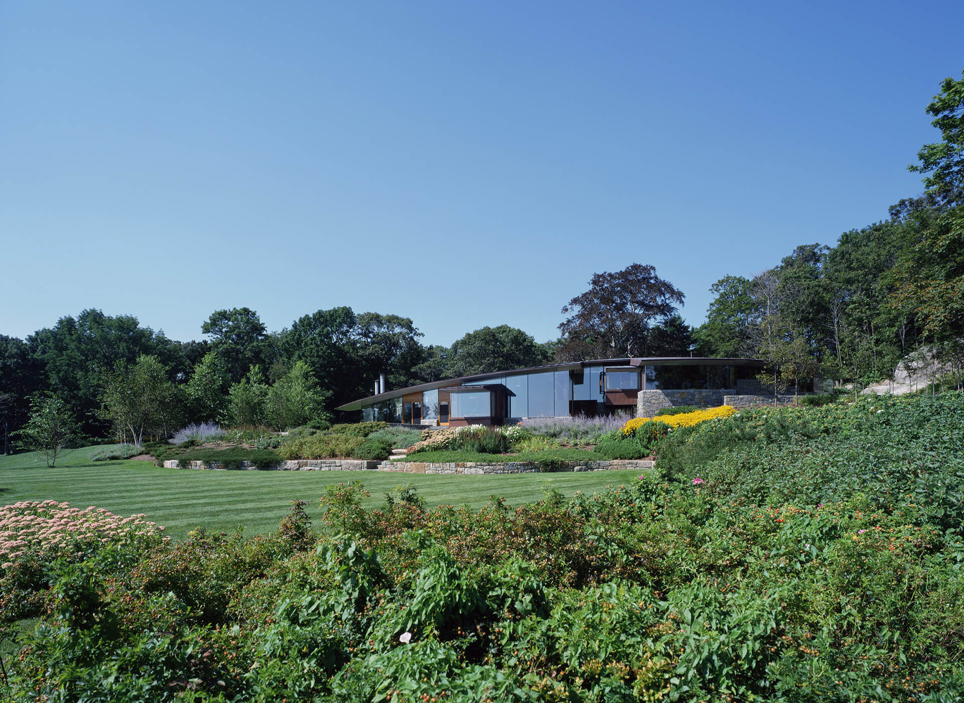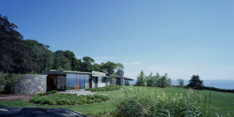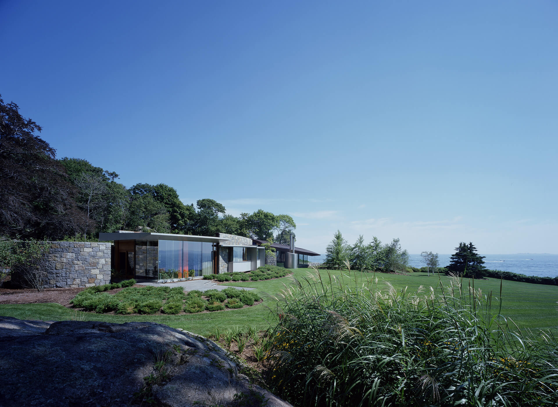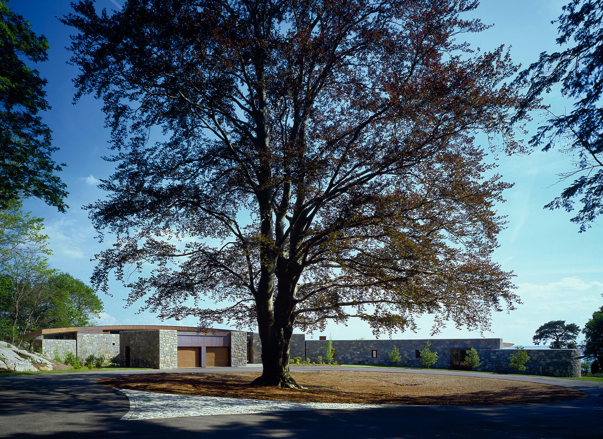 Designed with large expanse of glass towards an ocean view, and a stone wall towards the street, this contemporary home revels in curved forms. The curve of the house in plan is based on the radius of an enormous copper beech tree in the front yard. The curve of the roof allows the interior spaces to step down towards the terraced rear yard and to take advantage of the expansive ocean views.