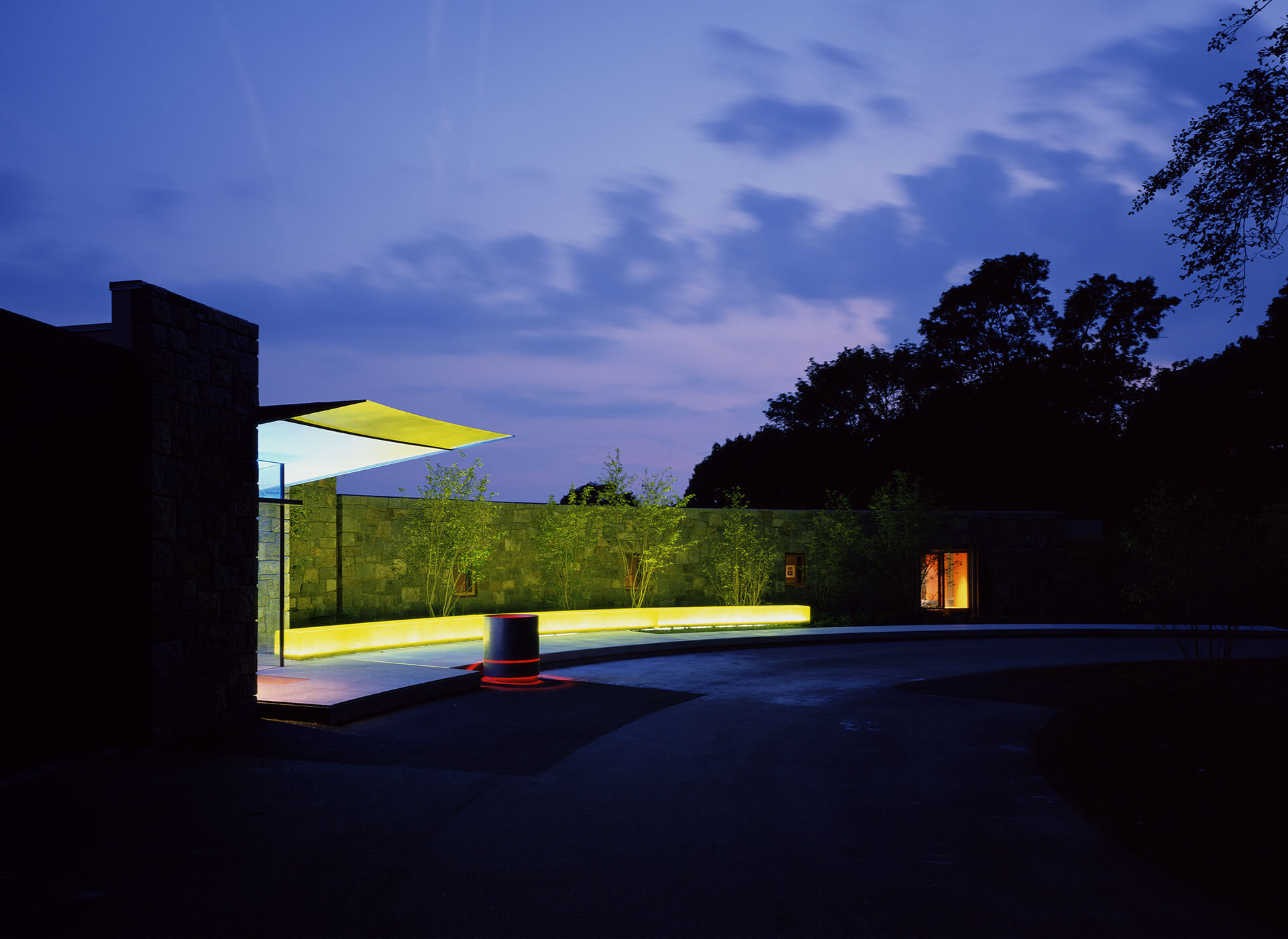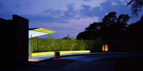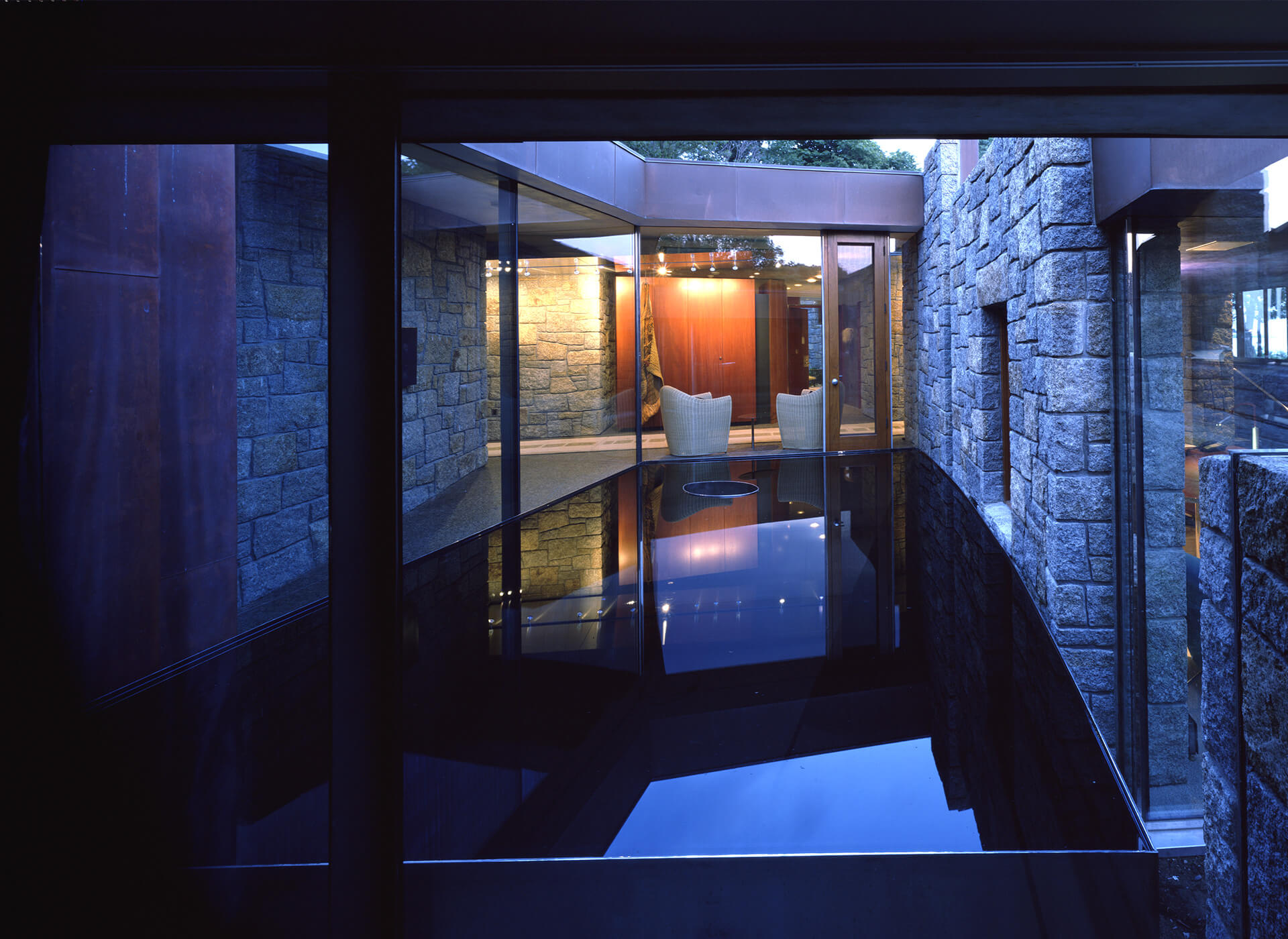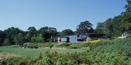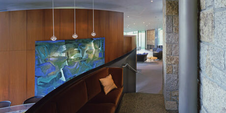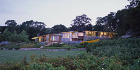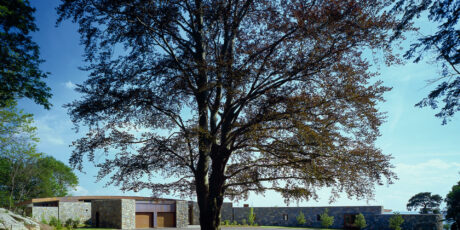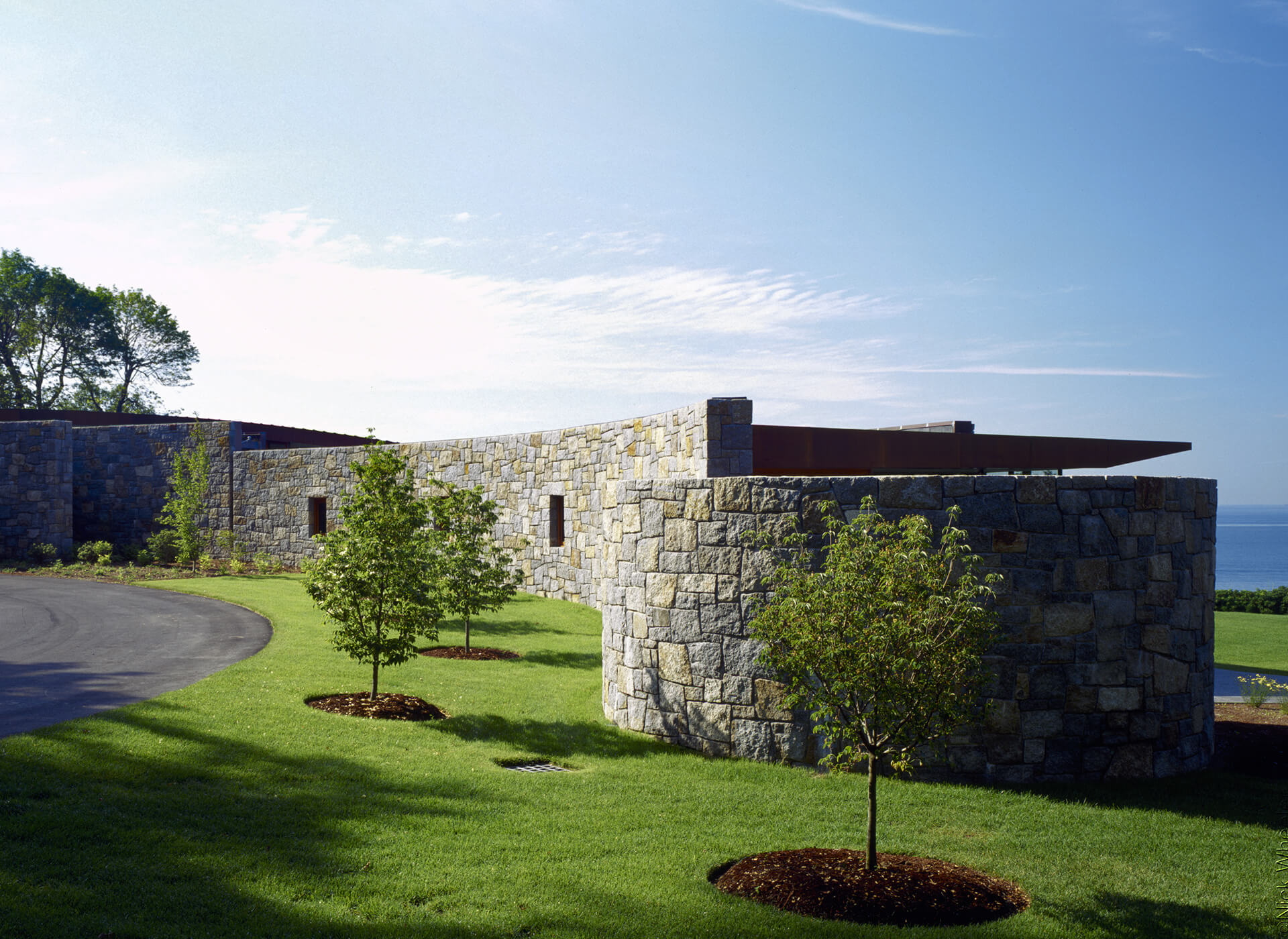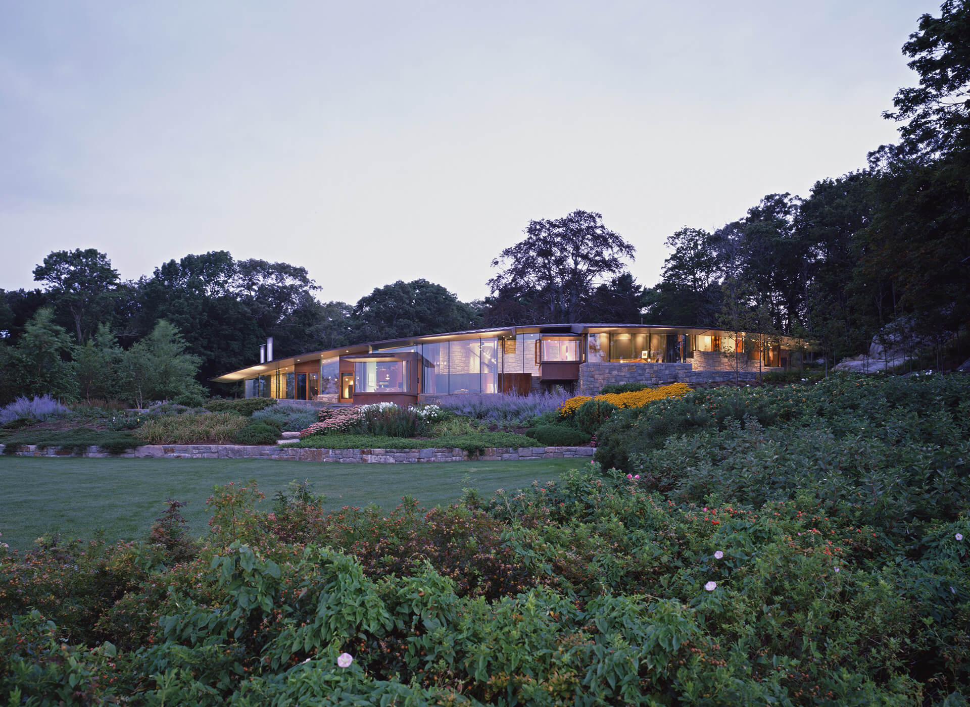 Designed with large expanse of glass towards an ocean view, and a stone wall towards the street, this contemporary home revels in curved forms. The curve of the house in plan is based on the radius of an enormous copper beech tree in the front yard. The curve of the roof allows the interior spaces to step down towards the terraced rear yard and to take advantage of the expansive ocean views.