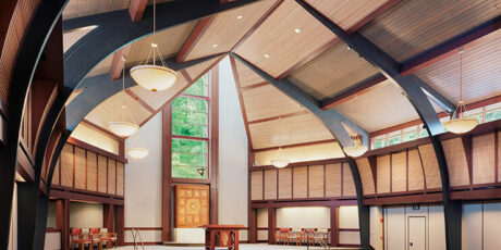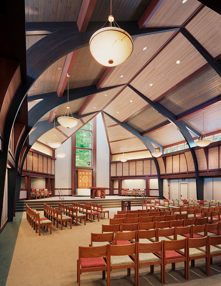 A growing congregation needed an addition that would allow them flexibility while maintaining their existing facility. Thoughtforms built the addition, which beautifully linked new with existing through a movable wall system. A ribbon of clerestory windows floods the gathering space with light while a large tower adds even more visual interest to the space.