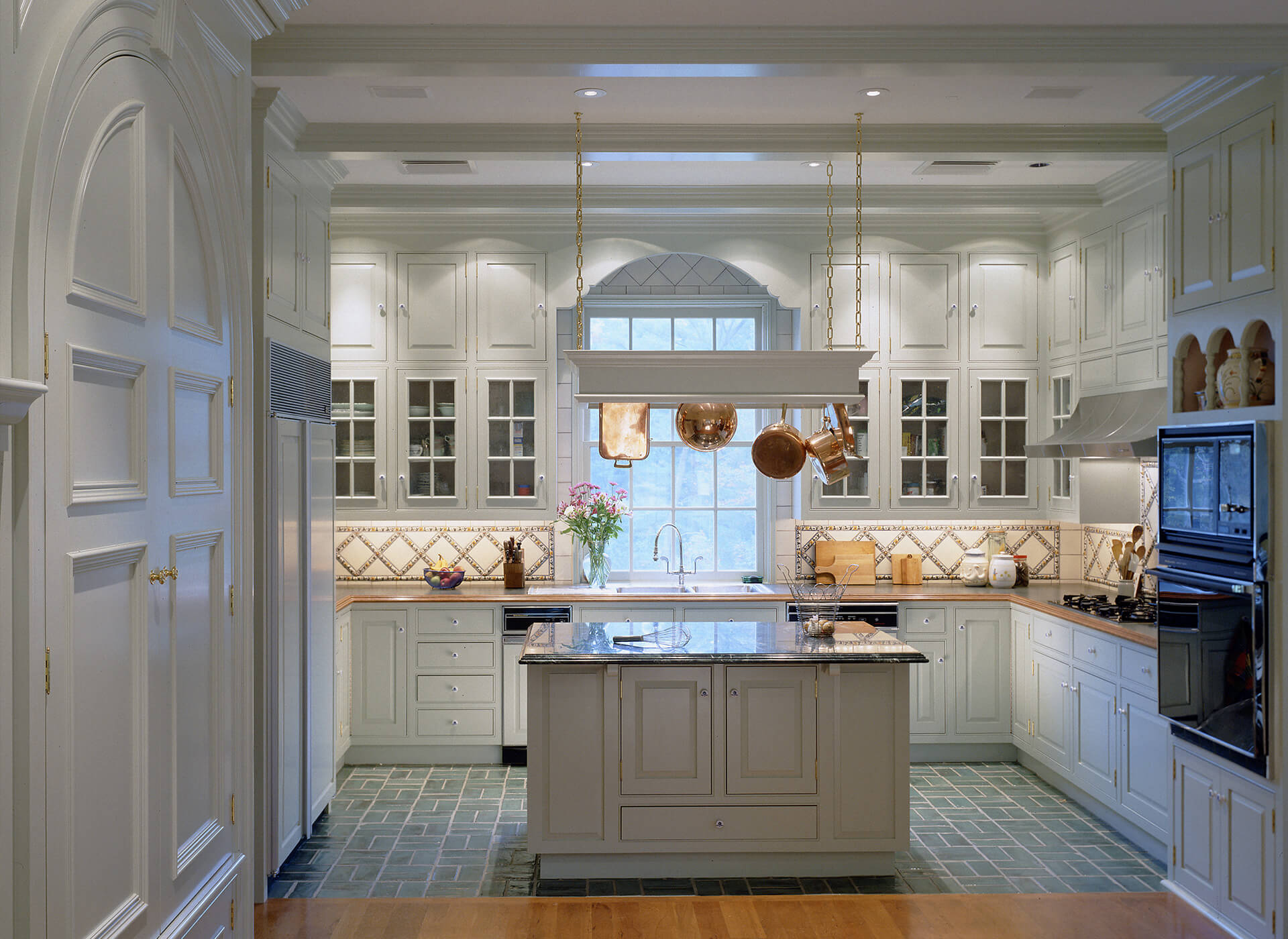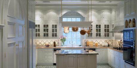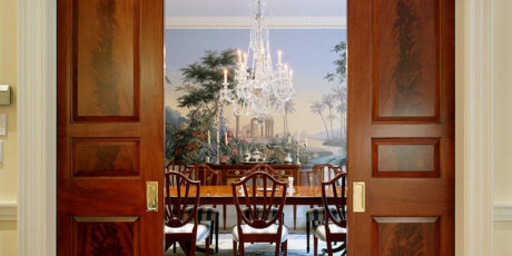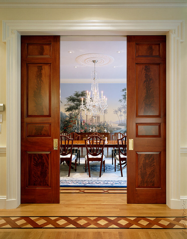 This traditional country estate near Pine Brook Country Club features several intricate details and refined craftsmanship. There is a formal library with crotch grain mahogany veneers in wall panels and doors. Also, an inlaid mahogany crosshatch pattern compliments the American cherry in the hardwood floors. There is even a custom mural in the dining room.
